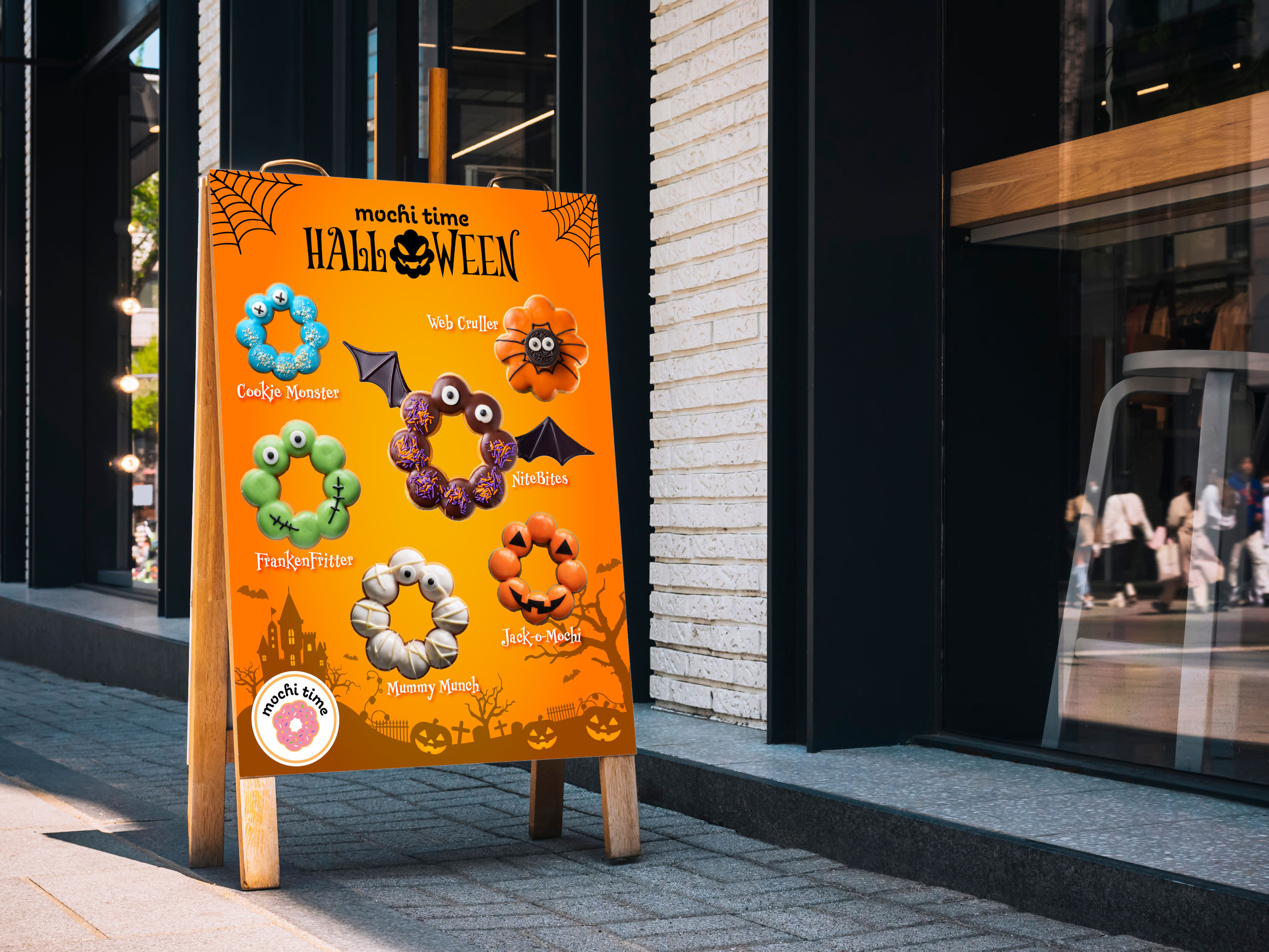 The project began with the creation of six Halloween-themed mochi donut concepts for Mochi Time. Each design was imagined as a playful character with a seasonal twist and a pun-based name that combined Halloween elements with the shape and charm of mochi donuts. These conceptual ideas served as the creative foundation for the visual exploration that followed.