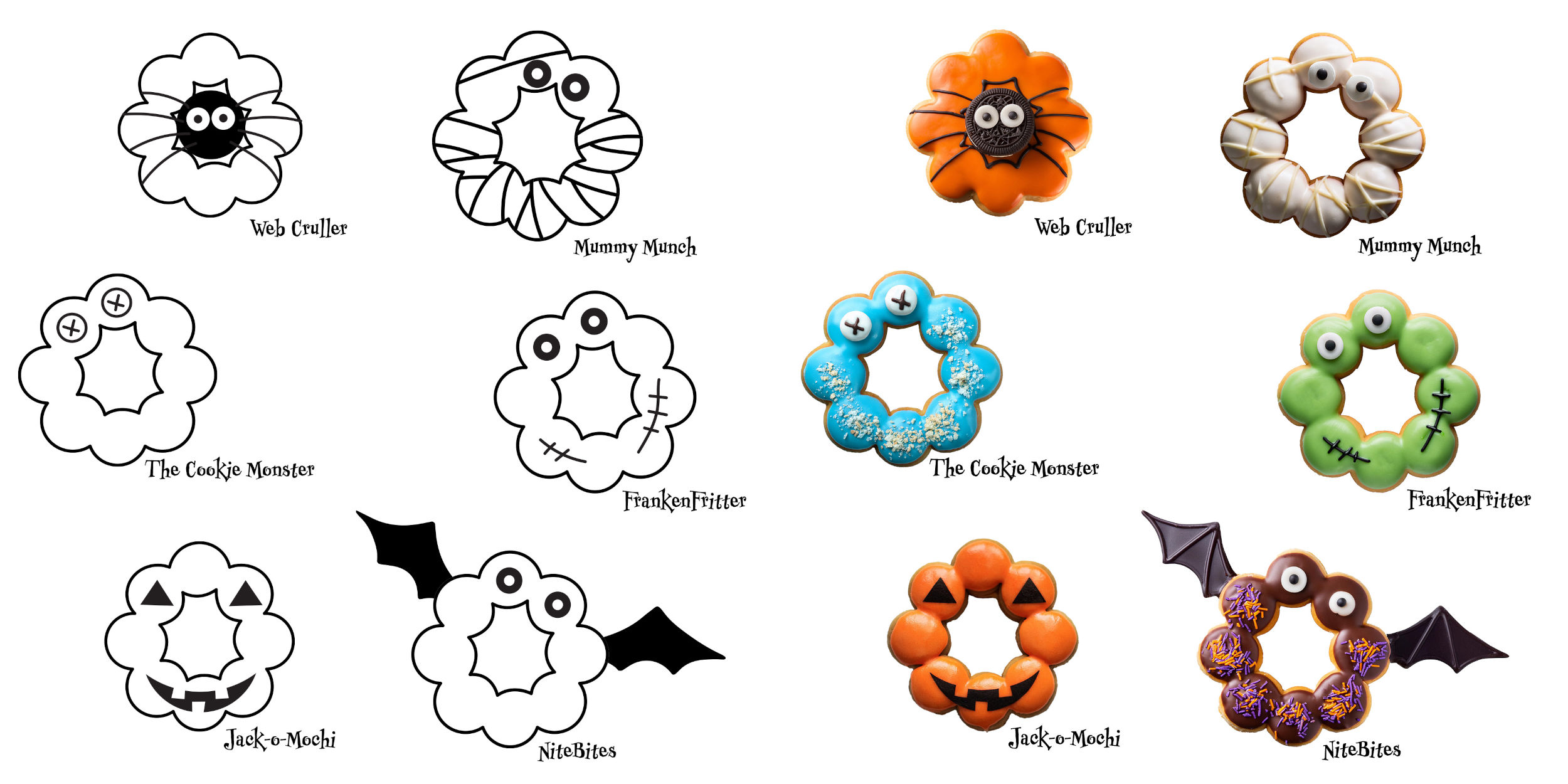 - Web Cruller - Orange frosting with a black Oreo cookie spider in the center, complete with candy eyes and chocolate legs